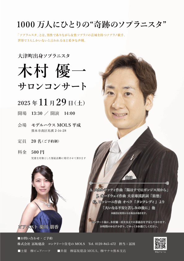 大津町出身ソプラニスタの木村優一さんのサロンコンサートを去年に引き続きモデルハウスMOLS平成で開催します。